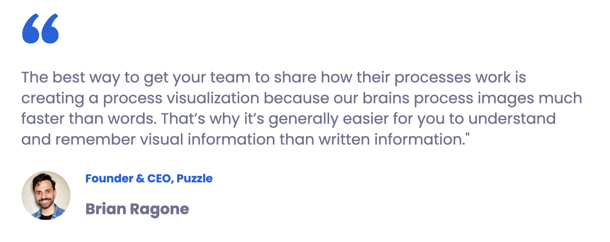 The best way to get your team to share how their processes work is creating a process visualization using tools like Puzzle because our brains process images much faster than words. That’s why it’s generally easier for you to understand and remember visual information than written information. This is known as the pictorial superiority effect (PSE), which basically means that we remember information better when it includes pictures.